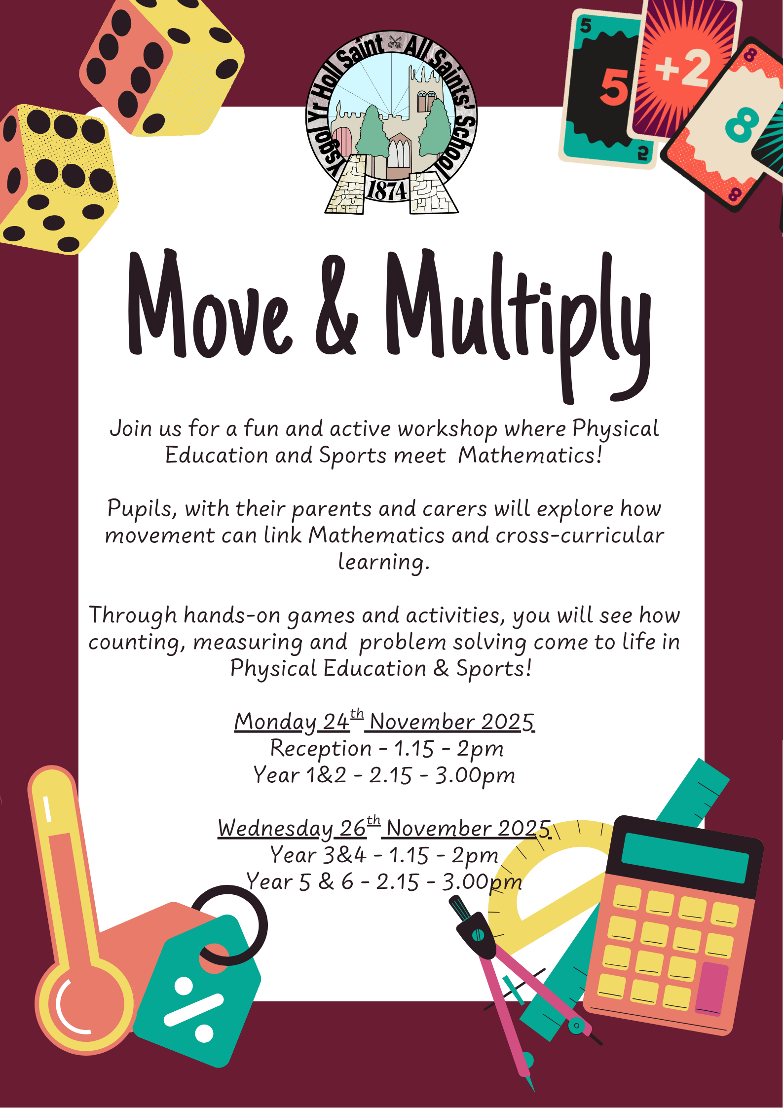 Come along and join us in an afternoon of Maths and Physical Education with your child!