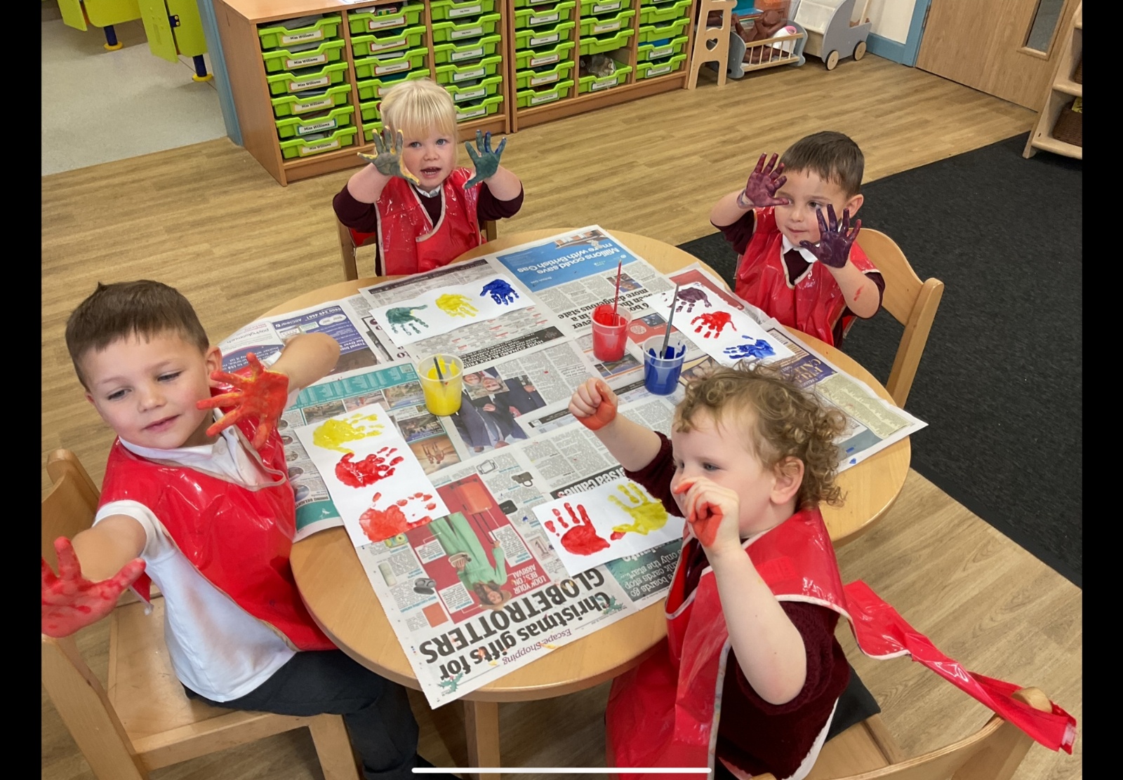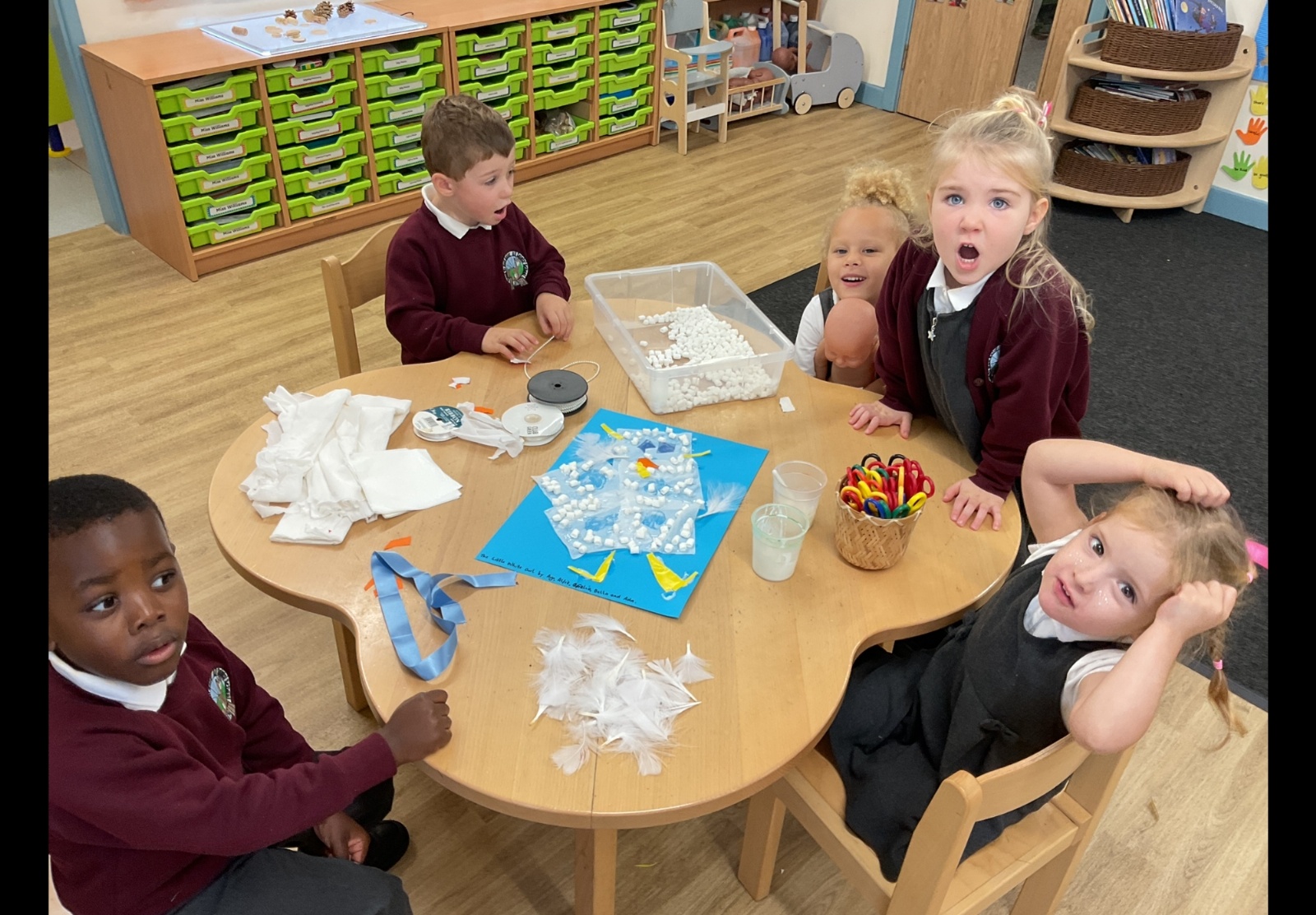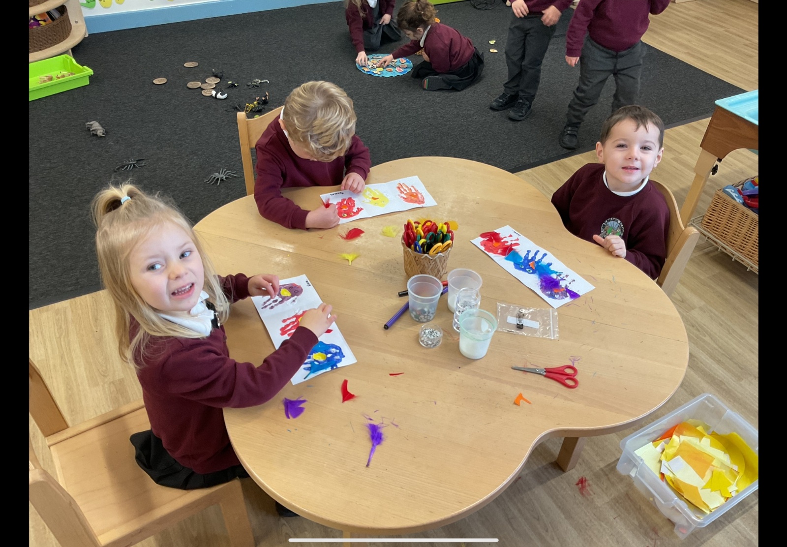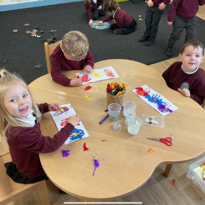 This week, pupils have been busy exploring in Forest School, creating an owl collage in groups linked to the little white owl story, colour mixing with hands and turning the handprints into owls adding 2 eyes, cutting beaks and matching coloured feathers.