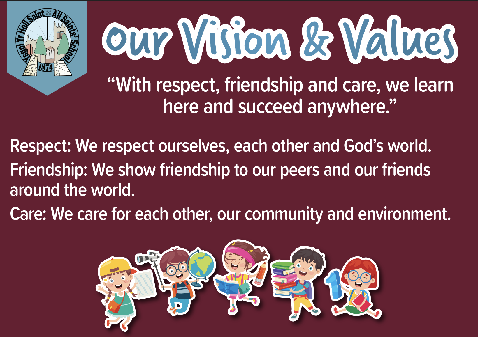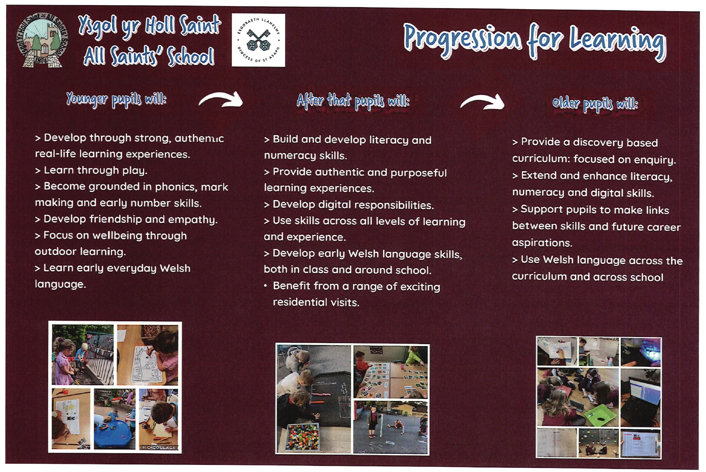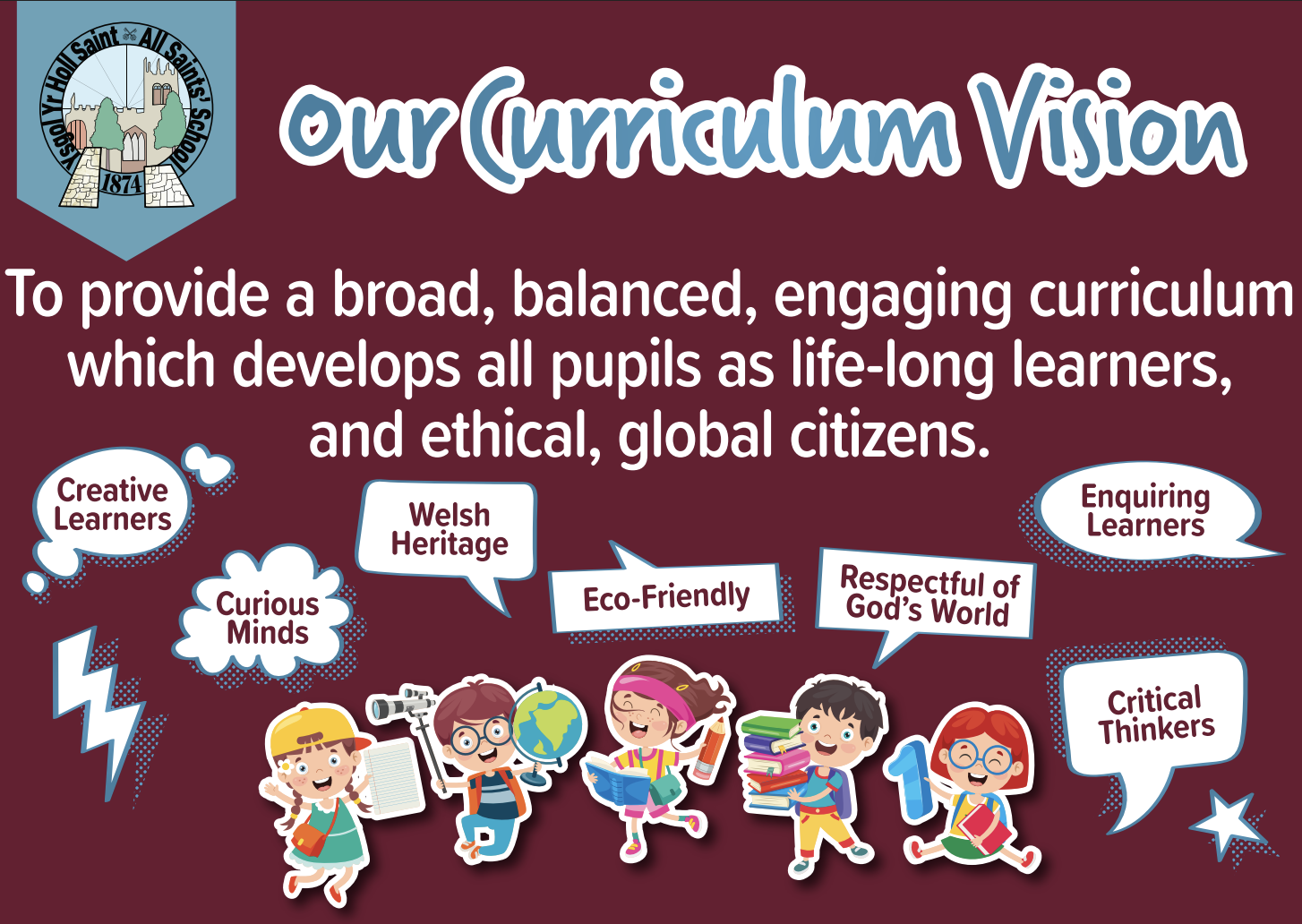 At Ysgol yr Holl Saint - All Saints’ School we are committed to providing a curriculum which is underpinned by the Four Purposes and aligned to the Curriculum for Wales 2022. Our curriculum is bespoke to All Saints’ school: it is rich in learning within our locality, with current global issues and it adheres to our Christian values. We aim to develop our pupils to be respectful of our world, be curious, enquiring, and able to think critically about their learning. They will encounter themes and topics which will be meaningful, inspiring, engaging, nurturing and celebratory.