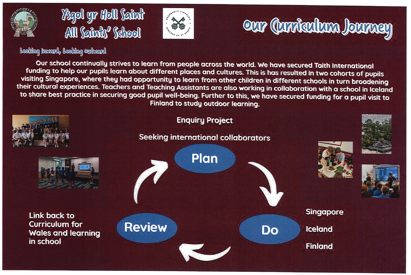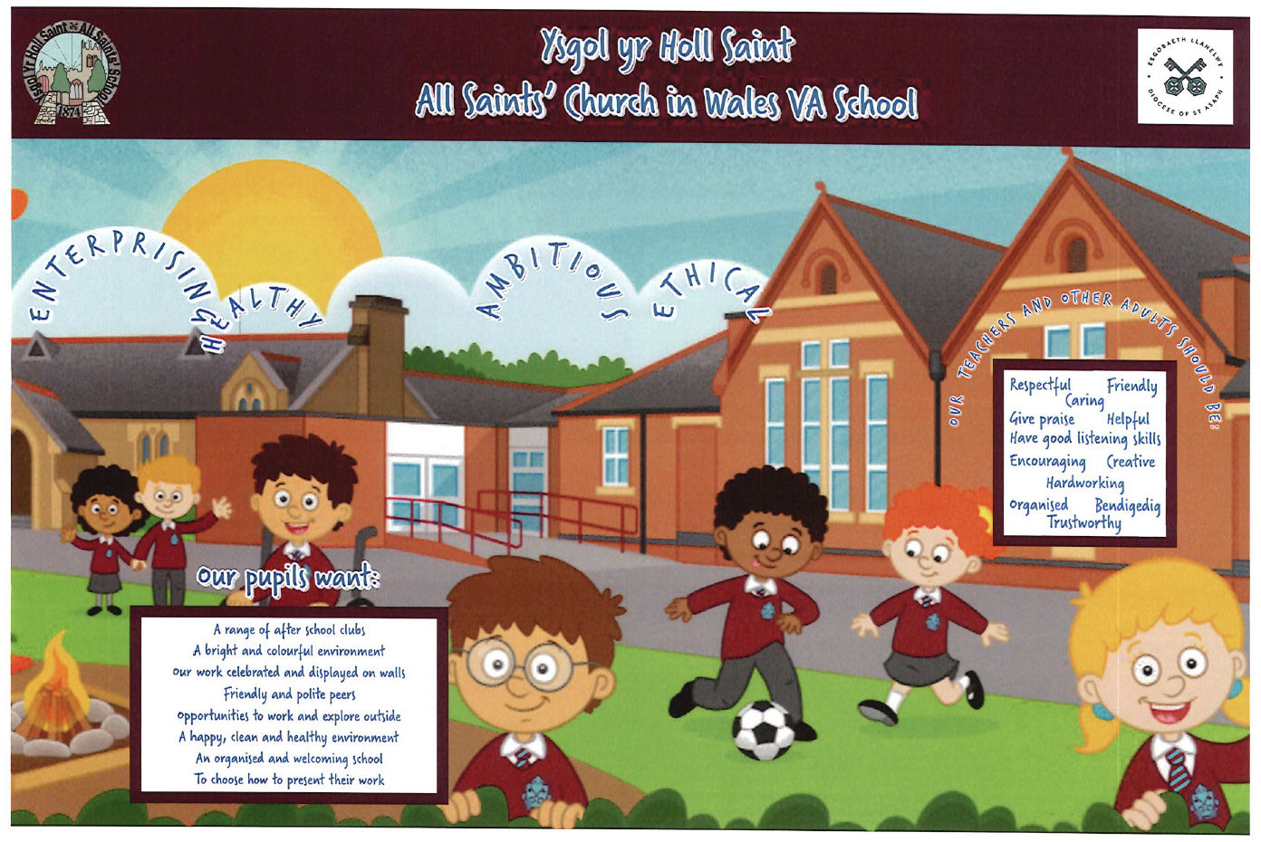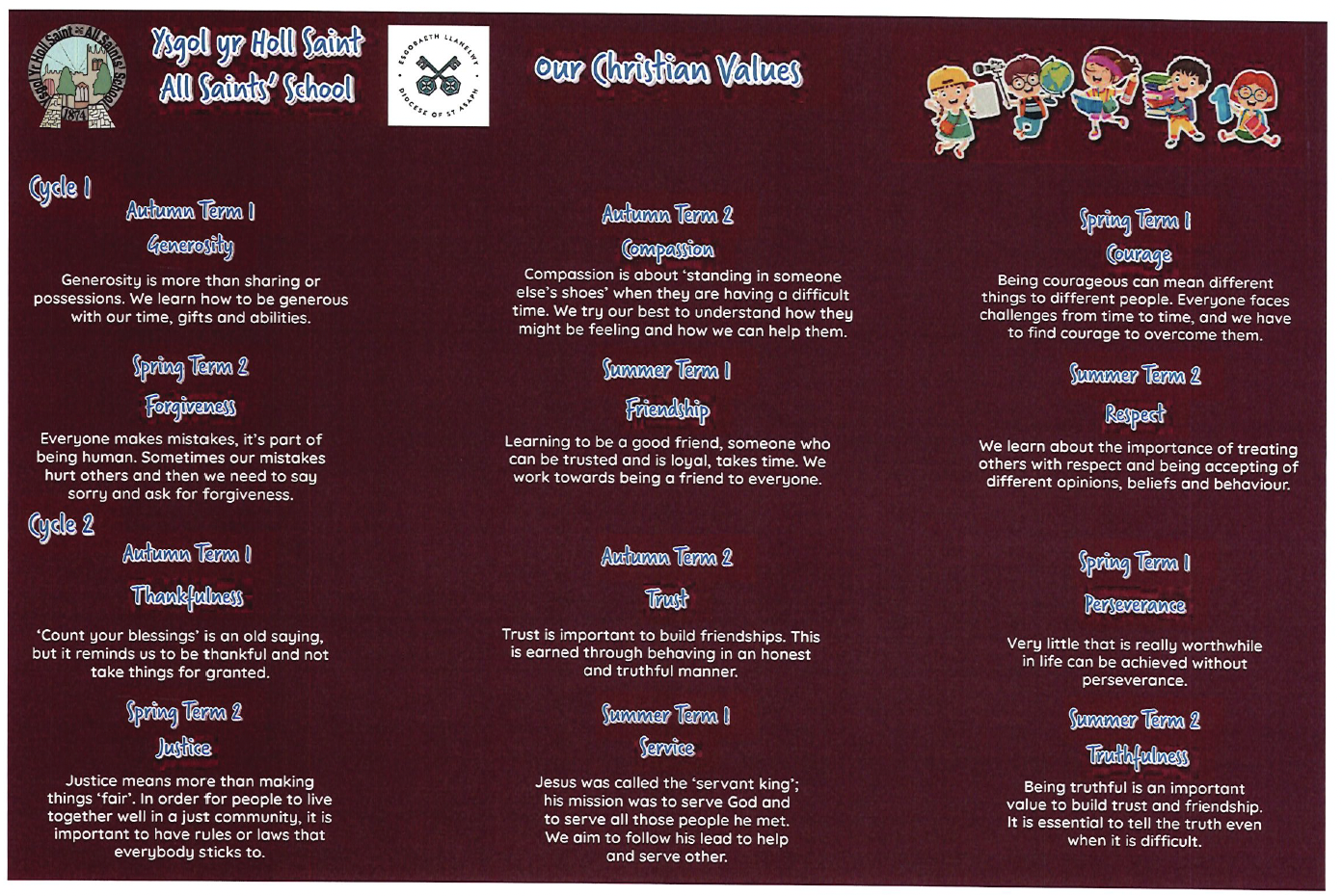 At Ysgol yr Holl Saint - All Saints’ School we are committed to providing a curriculum which is underpinned by the Four Purposes and aligned to the Curriculum for Wales 2022. Our curriculum is bespoke to All Saints’ school: it is rich in learning within our locality, with current global issues and it adheres to our Christian values. We aim to develop our pupils to be respectful of our world, be curious, enquiring, and able to think critically about their learning. They will encounter themes and topics which will be meaningful, inspiring, engaging, nurturing and celebratory.