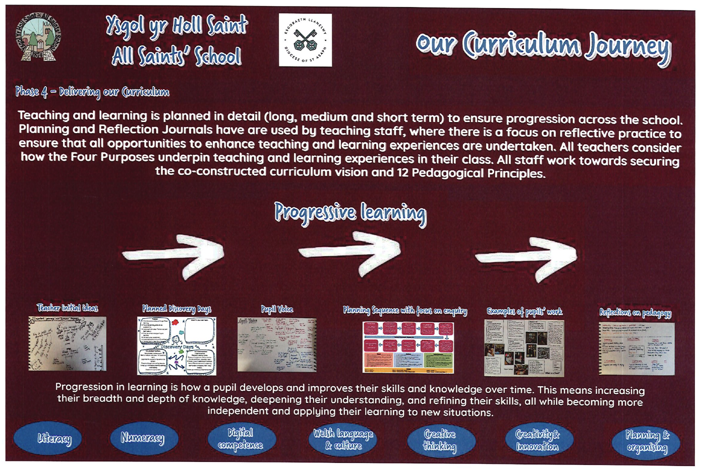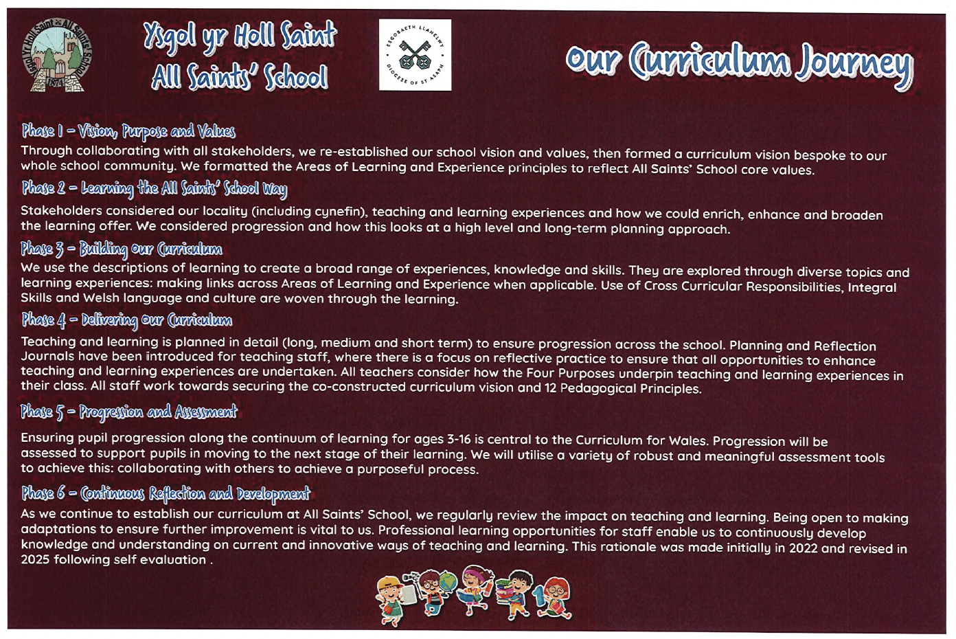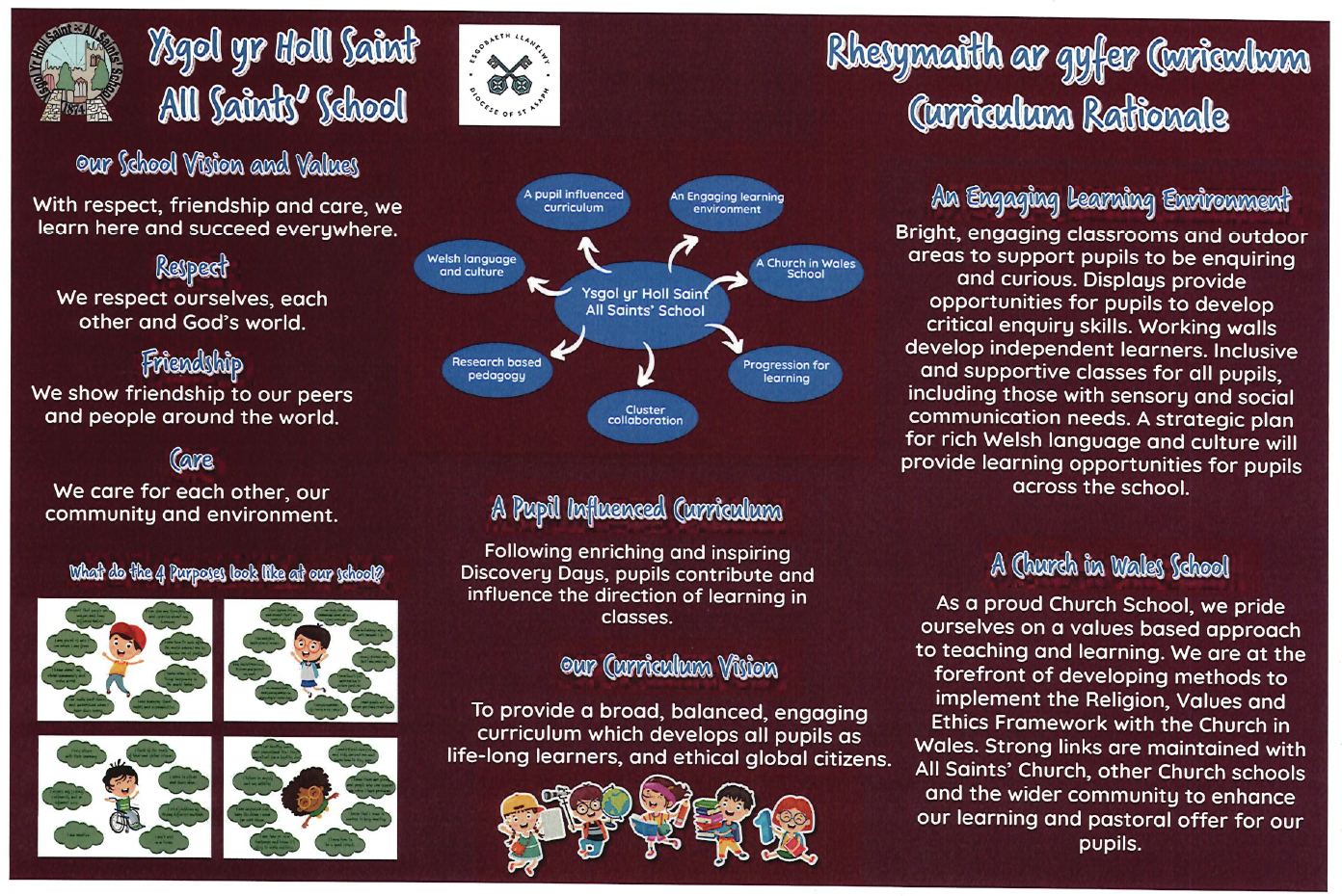 The rationale summarises the curriculum development approach undertaken by the school and how the Curriculum for Wales will be implemented within Ysgol yr Holl Saint - All Saints' School from September 2022, and from September 2025.